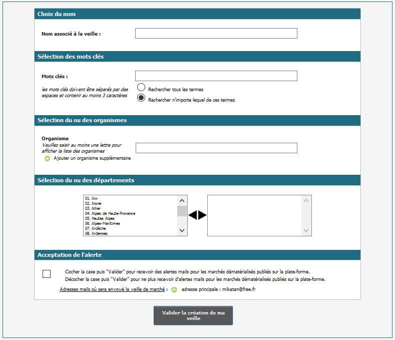Veille gratuite La veille des marchés est un outil pratique qui vous permet de créer des alertes afin de recevoir par email une notification concernant les avis liés à vos critères de recherche :